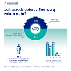 - Firmy po pierwsze cenią wygodę, a po drugie chętnie korzystają z opcji finansowania, które nie blokują ich kapitału. Jeśli chodzi o formułę zakupu, przedsiębiorcy mają spory wybór. Mogą korzystać z dużej liczby rozwiązań finansowania samochodu - od kredytu, przez leasing czy pożyczkę leasingową po wynajem długoterminowy. Z naszych danych, dotyczących okresu od początku działania platformy, czyli od lipca 2020 roku do końca listopada 2022 roku, wynika jednak, że zdecydowanie dominuje leasing i wynajem długoterminowy. Zauważamy trend wzrostowy dotyczący wynajmu - w 2020 roku jego udział w strukturze sprzedaży wynosił 37%, w 2022 roku już blisko 50%. Jeśli chodzi o długość trwania umowy, to w przypadku leasingu 43% firm decyduje się na finansowanie przez 36 miesięcy, a 24% przez 48 miesięcy. W przypadku wynajmu, 33% samochodów zostało zakontraktowanych zarówno na 36, jak i 12 miesięcy. Wynajem jest więc formą wybieraną na krótszy okres, pozwalającą szybciej i częściej wymieniać flotę – mówi Tomasz Otto, Dyrektor Departamentu Strategii i Marketingu odpowiedzialny za rozwój platformy Automarket.pl.