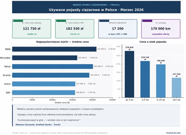 W bazie Truck1 największą liczbą ogłoszeń dysponują MAN (3 130 pojazdów, średnia cena 212 200 PLN) i Mercedes-Benz (3 050 szt., 162 040 PLN). Wyżej wyceniane są Volvo i Scania — 201 560 PLN i 192 140 PLN. Najtańszą opcją w zestawieniu pozostaje DAF — średnio 156 820 PLN przy 1 379 ogłoszeniach.