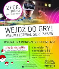 Już w najbliższą sobotę - 27 sierpnia - w godzinach 13:00-18:00 w Galerii Morena w Gdańsku odbędzie się Festiwal Gier i Zabaw. Przez cały dzień dzieci będą mogły uczestniczyć w animacjach i konkurencjach na symulatorach 7D i 5D oraz rywalizować o nagrody, między innymi iPhone’a 6S. Wśród zaplanowanych atrakcji znalazło się także wielkie polowanie na Pokemony ukryte w Galerii za pośrednictwem aplikacji Pokemon GO.