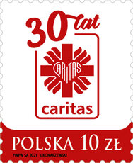 Na znaczku zaprezentowano logo 30 lat Caritas Polska. Wzdłuż dolnej krawędzi umieszczono napis: POLSKA i oznaczenie wartości: 10 zł.