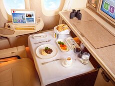 Kino w przestworzach: klienci klasy pierwszej podczas oglądania dowolnego z 5 000 kanałów w systemie rozrywki pokładowej ice mogą zamówić kinowe przekąski. Menu przekąsek kinowych obejmuje smakowite klasyki, takie jak rolki homara, soczyste mini-burgery, fasolę edamame i solony popcorn. Można zamówić je na żądanie. Wszyscy pasażerowie mogą przed lotem zaplanować swoją własną rozrywkę, przeglądając i wybierając filmy lub programy telewizyjne w aplikacji Emirates, które następnie można zsynchronizować z systemem ice w momencie wejścia na pokład.