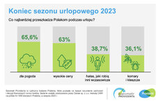 – Konieczność odbierania służbowego telefonu podczas dni wolnych to z pewnością duża niedogodność – około co 10. respondent wskazuje, że wypoczynek utrudniają mu myśli o pracy, czy obowiązki z nią związane. Jednak Polakom zdecydowanie najczęściej przeszkadza podczas urlopu zła pogoda. Odpowiedziało tak 65,6 proc. badanych – zauważa Karolina Łuczak. – Na drugim miejscu, wskazane przez 63 proc. ankietowanych, znalazły się ceny.